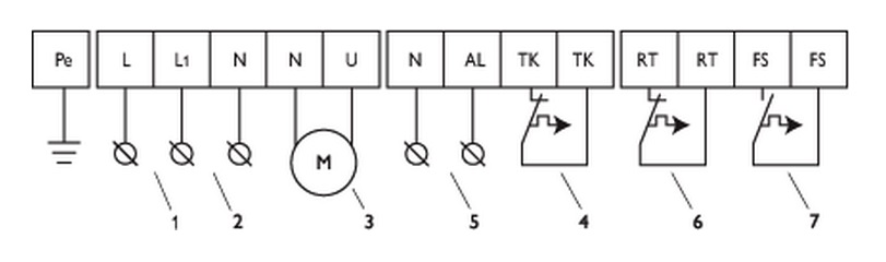 В регуляторах скорости предусмотрен нерегулируемый выход 230 В, который может использоваться для подключения электроприводов воздушных заслонок или другого оборудования. Кроме того, у регуляторов есть нормально замкнутый и нормально разомкнутый контакты для внешнего управления.